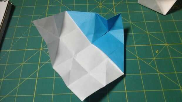 La última foto muestra la primera esquina terminada con el resto de esa aleta escondido debajo de modo que los bordes se alinean con el contra el interior del cubo.