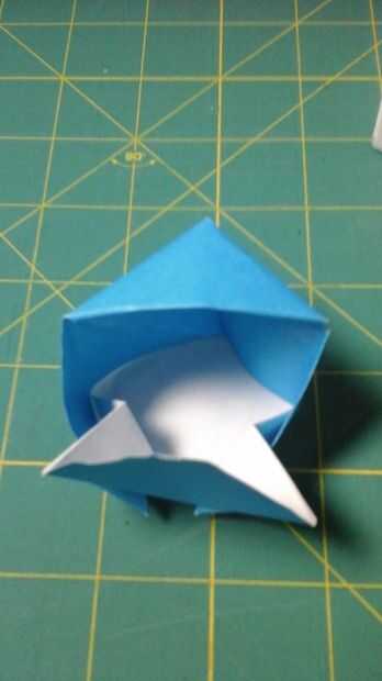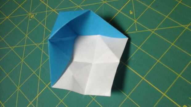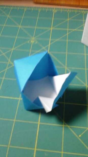 Este es probablemente el doblez más intrigante, que oculta el interior de la caja, al crear las otras paredes dos esquina, para un corte efecto pirámide. Como se puede ver en las fotografías, es como una lengua que dobla hacia arriba y luego mete cuidadosamente dentro de la caja.