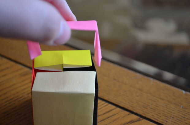 conecté 14 cubos juntos para crear la cadena de cubos arco iris vista por encima. Tomó 168 hojas de papel.Usted puede hacer un cubo abierto propio usando solo 12 hojas de papel y algunos dobleces simples. Estos cubos abiertos son bastante divertido y