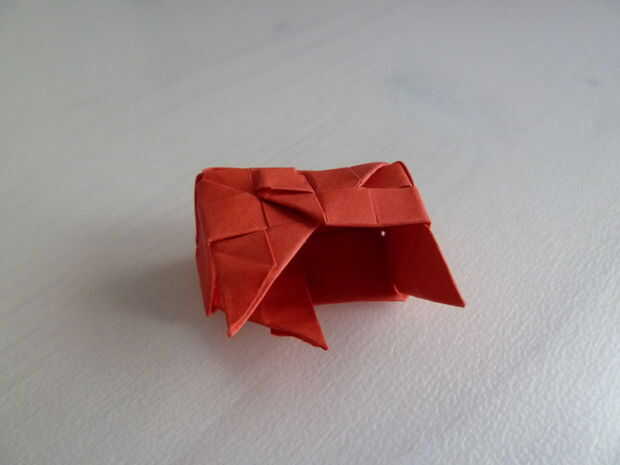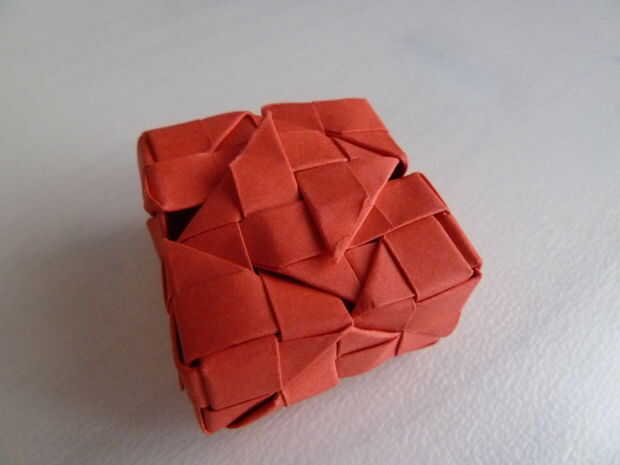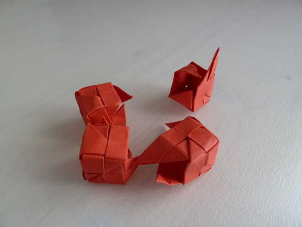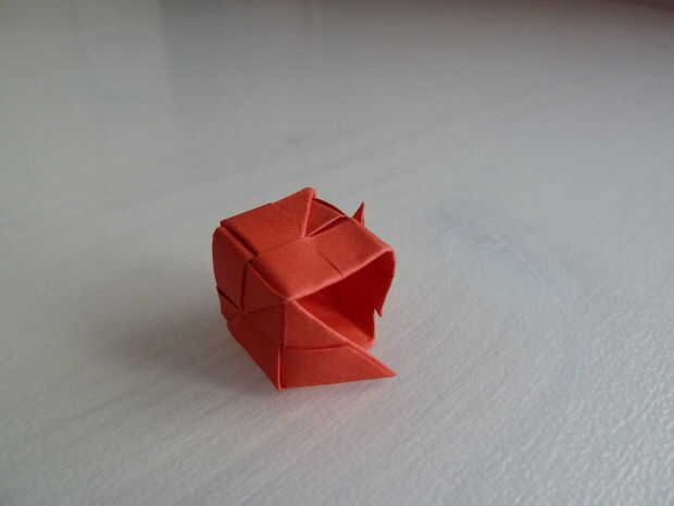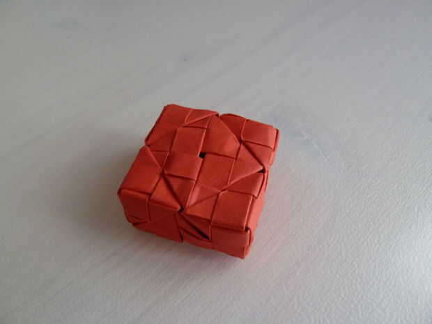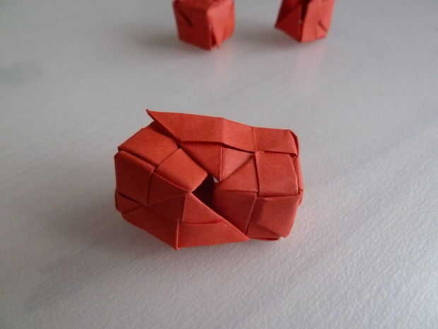 Esta forma es el único que no utiliza los cubos abiertos básicos. En vez de eso, parar cuando se han unido cuatro módulos. Hacer cuatro de estas formas. Únete a dos de ellos para crear la primera mitad de la Plaza. Únete a los otros dos para la segunda mitad. Lo único que queda para hacer ahora es unir las dos mitades. Cuando de los triángulos y los bolsillos, esto no debería ser demasiado difícil de hacer.