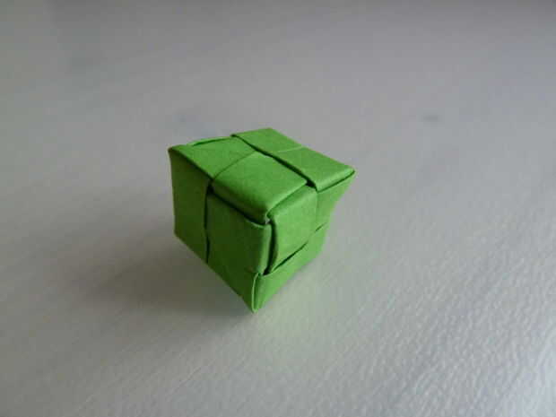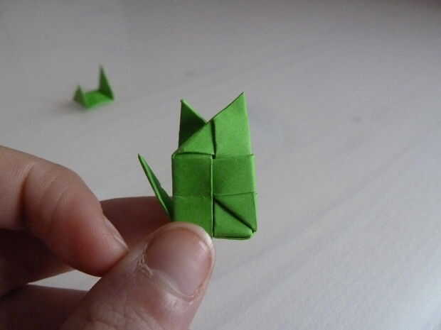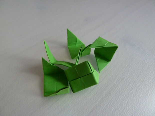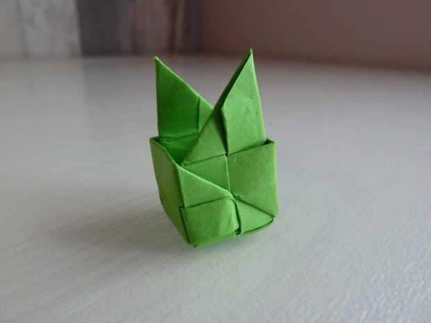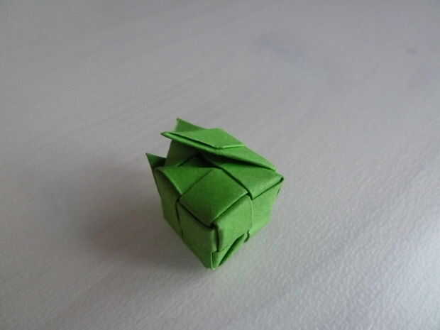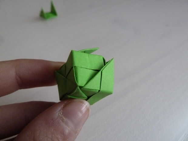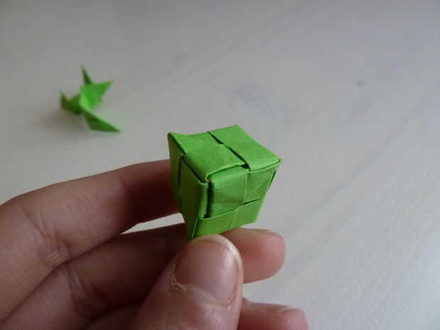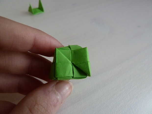 Hacer cinco de los módulos. Inserte un triángulo uno de los bolsillos como se muestra. Repetir este proceso con una tercera pieza, pero también uno de los triángulos del primer módulo agrega al bolsillo del tercer módulo. Cuando se agrega una cuarta, no importa a qué bolsillo se agrega el triángulo. En este punto tienes una esquina bastante sólida. Sólo tiene que añadir el triángulo a uno de los bolsillos y la mirada que triángulo caben en uno de los bolsillos del cuarto módulo. Repita esta una vez más para agregar el módulo quinto. Si todo ha ido según lo planeado, ahora debe tener un cubo con la tapa abierta. I no ir como planeado, intento hacer un cubo como se muestra aquí (paso 4), pero no agregar el sexto módulo.