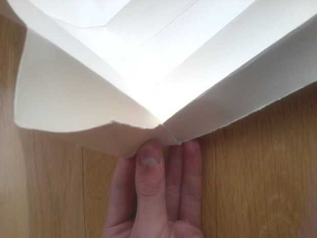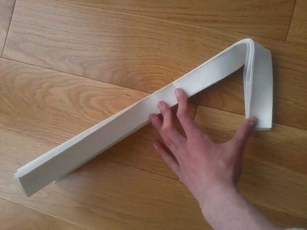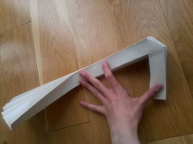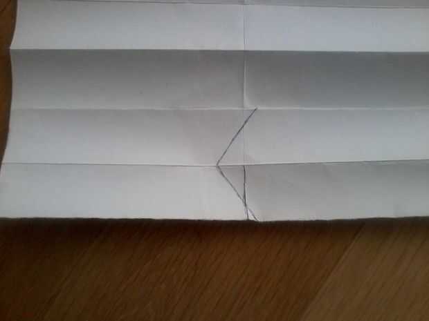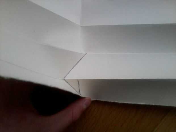 En primer lugar contraerlo todos (doblez hacia arriba y luego hacia abajo y repita). A continuación doblar a lo largo del último pliegue hecho en el paso 3 que su ángulo agudo (este ángulo no puede ser 90 o no funciona como debería funcionar un cubo de 40-50). Abrirlo y reversa doble a lo largo de ese ángulo, repetir este proceso hasta que toda la hoja.