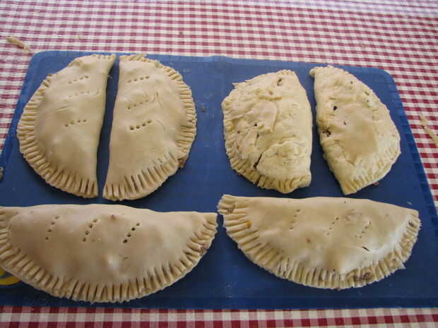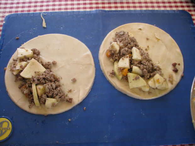 Agregar relleno a una mitad del círculo, plegar y aplaste los bordes. Corte ranuras en la parte superior para dejar escapar vapor.