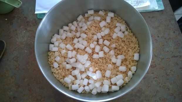 Mezclar el Arroz Kripies y los malvaviscos juntos.