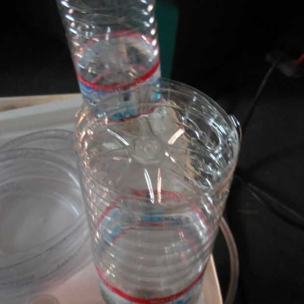 Luego corte la parte inferior de la botella de agua. Dejé la botella tan alta como sea posible. Esto funciona bien para que con el fondo viejo como tapa para mantener humedad por esquejes o semillas. Algunas personas pintan las botellas de agua para hacerlos opacos. Yo no se moleste.
