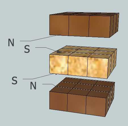En cada dirección, el cubo puede ser cortado por dos planos, dividiendo el cubo en tres capas (ver imagen de arriba). Correspondiente a cada plano, habrá dos caras de arce: uno en la central (tan) capa hacia fuera y uno una capa externa (marrón) en. Todo lo que necesita hacer para asegurarse que las polaridades son correctas es para asegurarse que las caras de las capas exteriores en todos los "N" y las caras en el interior señalando las capas son todas "S". Esto asegurará que los imanes se alinean N a S independientemente de cómo el cubo ha sido codificado, ya que un azulejo en una capa externa siempre será en una capa externa, y una teja sobre una capa interna siempre estará en una capa interna.