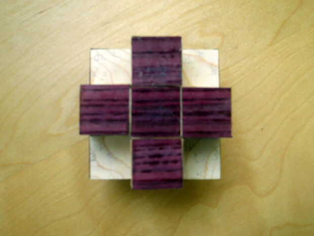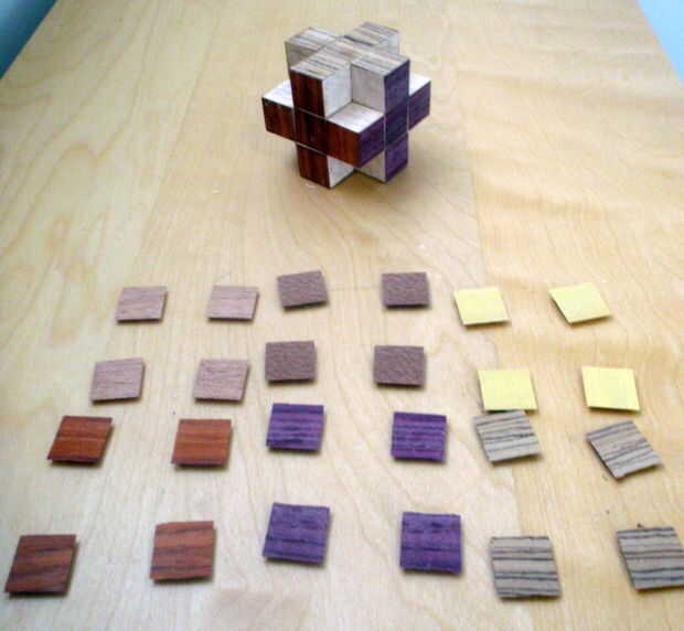 Como pegué el cubies, ponerlos juntos para formar el cubo. Comenzó con lo más íntimo cubie, luego que los seis centros que se anexan a ella, luego los bordes, luego las esquinas. Todavía necesitaba desmontar los cubitos para hacer más trabajo (lijado y acabado), pero quería asegurarse de que todo alineados correctamente. También fue muy satisfactorio ver el cubo toma forma por primera vez.