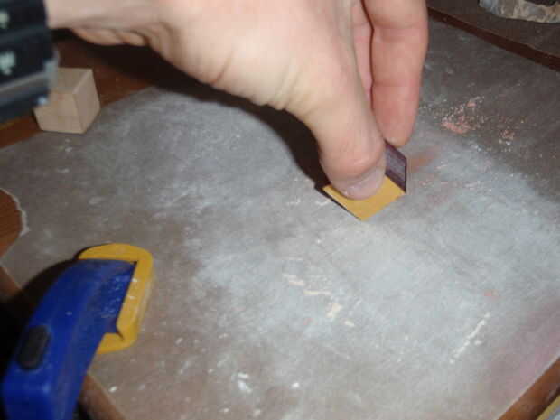 Me pareció la mejor manera a la arena de estas pequeñas piezas que sujete un trozo de papel de lija a la mesa y después frotar la pieza hacia adelante y hacia atrás, en lugar de mover el papel de lija en una pieza estacionaria. Funcionó, pero fue lento y tedioso proceso. Apuesto que una lijadora eléctrica de algún tipo, habría sido útil...