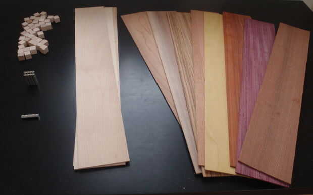 Quería hacer cada cara del cubo de Rubik de un diferente tipo de madera. Hice algunas investigaciones sobre maderas exóticas interesantes y terminó por ordenar esta madera en línea de un proveedor de Sierra de calar. Vino en tablas que eran 1/8" de espesor, 4'' ancho y 2' de largo, que era perfecta para mis propósitos. Porque estaba ordenando en línea y podría no saber con certeza a qué se parecería, tengo ocho tipos de madera para Paramentos exteriores posibles. En la foto de arriba son, de derecha a izquierda: lacewood, purpleheart, padauk, yellowheart, caoba, zebrawood, cerezo y nogal. Me gustó el cerezo o el nogal tanto como pensé, así que decidí usar los otros seis. También tengo cuatro tablas de Maple para uso en todas las caras interiores.