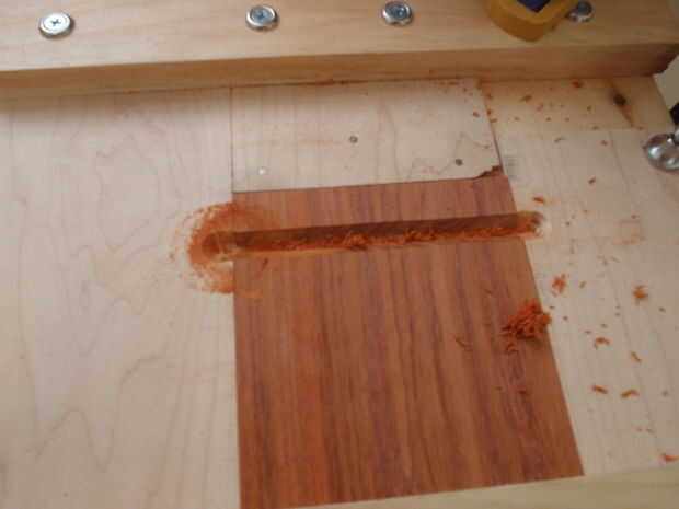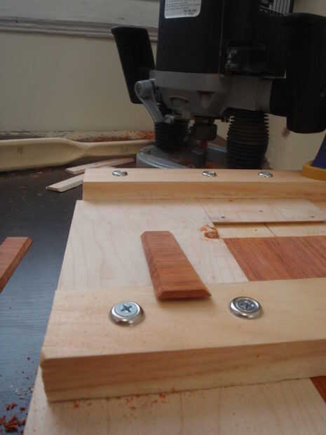 Esta pieza de tapón pequeño debe ubicarse precisamente para que las tiras son exactamente la anchura correcta. Esto puede lograrse por la medida de cuidado, y luego prueba y error para ajustar el ancho. La anchura puede ser bien ajustado sin mover el tope de ajuste de la profundidad de la broca de fresadora. He intentado minimizar el jugar con la profundidad, sin embargo, porque quería que la brecha entre las tiras más pequeñas posible para el grano sería mejor.