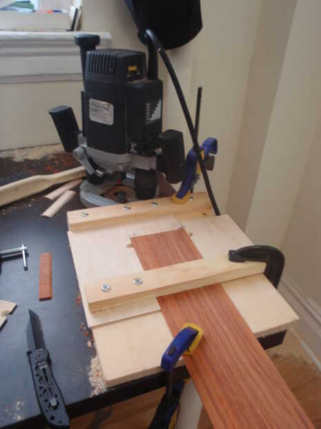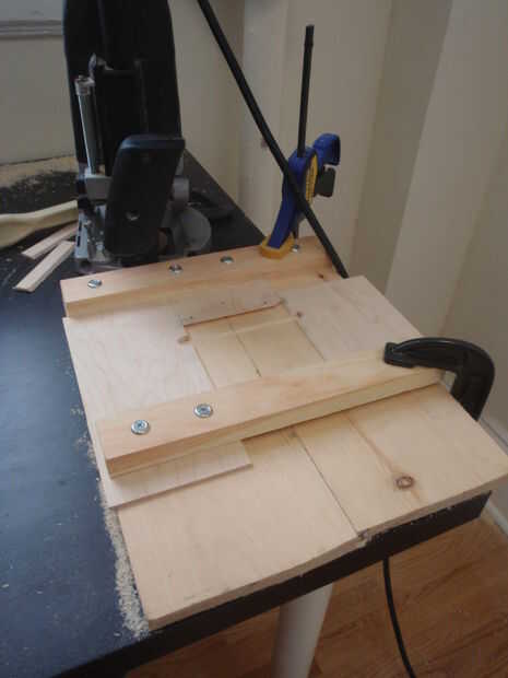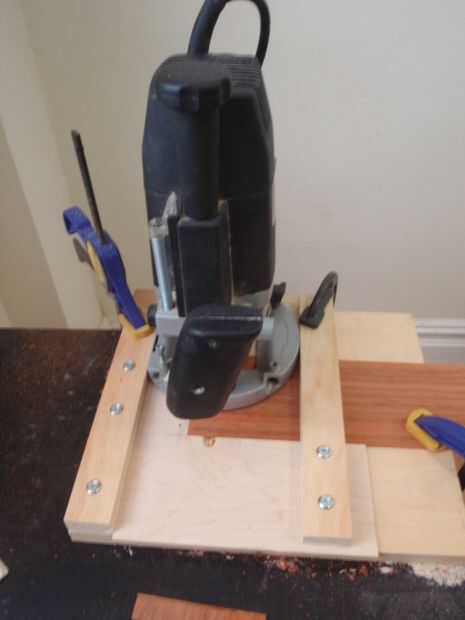 No doy completas paso a paso las instrucciones para hacer la plantilla, como estoy seguro que hay múltiples maneras de lograr el mismo objetivo, pero espero que las fotos con claridad cómo funcionaba mi plantilla. La idea principal era que dos tableros paralelos en la parte superior que obliga el router a moverse sólo en una dimensión. Éstos fueron montados en una placa base, pero fue entre una capa de madera gruesa de 1/8"(yo usé algunos de arce, ya que tenía extra) con un espacio para la Junta que debía cortarse. Después de la Junta en el lugar de sujeción, el router cortar una línea recta perpendicular a la dimensión larga de la Junta, dejando un bisel de 45 grados sobre el extremo cortado.