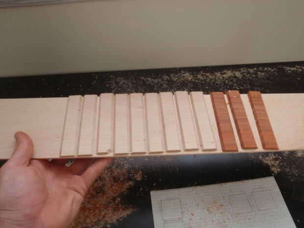 Una vez que la plantilla fue cuidadosamente calibrada, lo utilizado para producir todas las tiras que necesitaría. Más adelante quisiera volver a configurar la plantilla y cortar las tiras en tres fichas. Necesitaba tres tiras de cada una de las maderas exteriores (suficiente para una cara), y necesitaba 36 tiras de arce (suficiente para doce caras). Hice unas tiras de arce extra tener repuestos para los siguientes pasos.