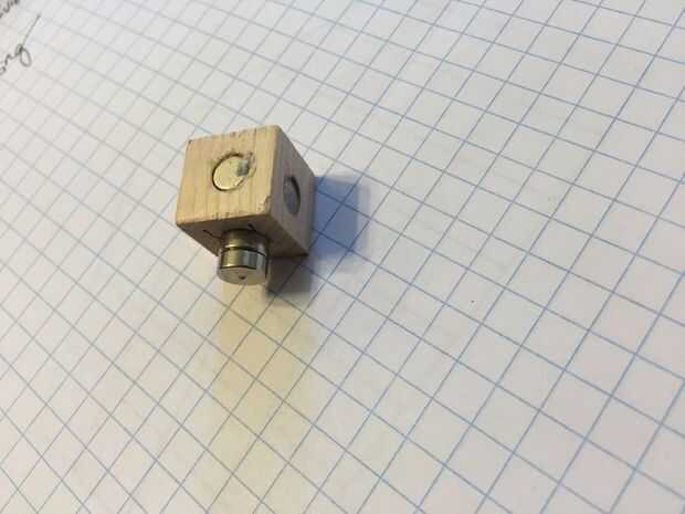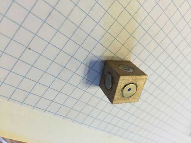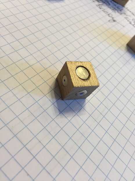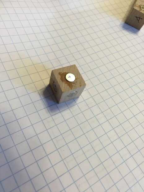 En este paso, mi papá me ayudó a pegar todos los imanes en los cubos. Lo más difícil fue en gran medida la pieza base porque los imanes los imanes más fuertes y fueron todos repele el uno con el otro. Terminamos con tres pinzas para mantener juntos mientras se secaba. Las piezas más próximas eran los bordes porque había cuatro imanes que fueron tratando aparte, y aunque ellos eran los imanes más débiles, aún querían alejarse entre sí. Mi padre y yo averiguado que puede poner unos imanes en el exterior (como se muestra en la imagen) para tratar de contrarrestar las fuerzas magnéticas. Las esquinas fueron comparativamente fáciles, puesto que había solamente tres imanes repeler entre sí, pero los medios eran en gran medida la más fácil. Esto es porque el imán grande de conexión a la base tenía la polaridad opuesta de los imanes más pequeños, haciendo que contrarrestar las fuerzas de rechazo.