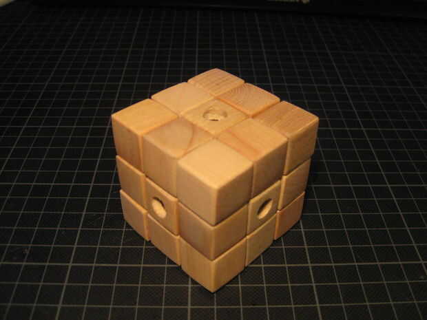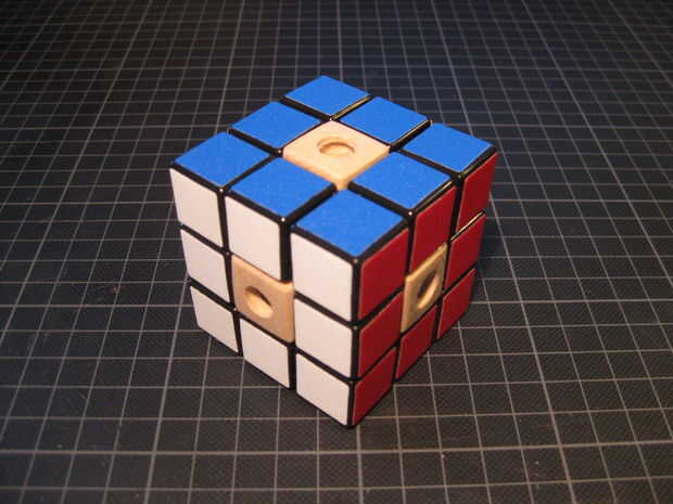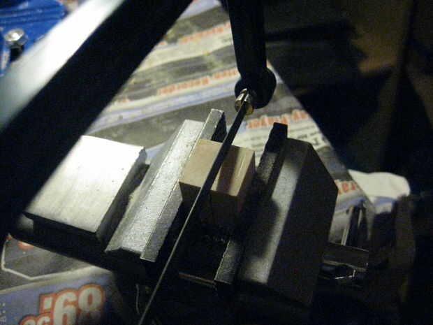 Luego marque el centro del cubo y el taladro de una 9mm agujero a través de todo el camino. Ahora cortar el cubo de la mitad como se muestra en la cuarta foto y perforar un segundo agujero de 12mm a la mitad de ambas mitades. Pulir las esquinas y montar la pieza en la plataforma.