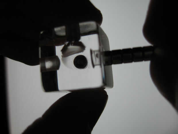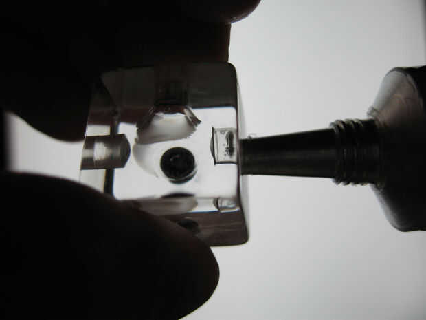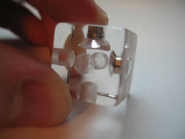En la tercera imagen, verás un interesante fenómeno de mis opciones de materiales. Cemento DUCO se alimenta a través de fallas en acrílico. Así, el círculo en el extremo del eje del aburrido, donde se encuentra con la corona, "florecen" hacia fuera en un cono de ángulo de aproximadamente 45 grados. Muy bonita, aunque no lo que yo pretendía. Algunas de estas flores tiene bastante complejo y ondulado, pero más justo apareció como la cónica nube de vapor que rutas de jets supersónicos. Como el pegamento rehardened cada vez, no se vio comprometida la integridad estructural de los cubos. Si hago otro cubo, voy a probar otras colas para encontrar un bonito claro que no hace esto, pero todavía tiene este tipo de fuerza y tiempo de secado rápido (30 segundos o menos). Es una cosa interesante para ver, sin embargo.