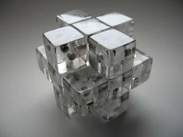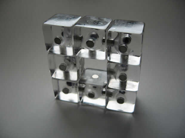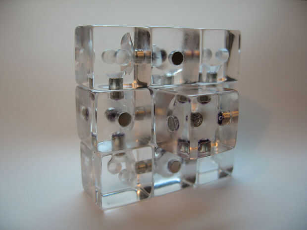 Lo nota en las fotos que usted puede hacer ahora una capa central de 3 x 3 con 1 pieza central, 4 centro cara piezas y 4 piezas de borde. También puede retirar la pieza central - algo que no se puede hacer con un cubo de Rubik normal. También puede crear el cubo entero ahora, sin esquinas.