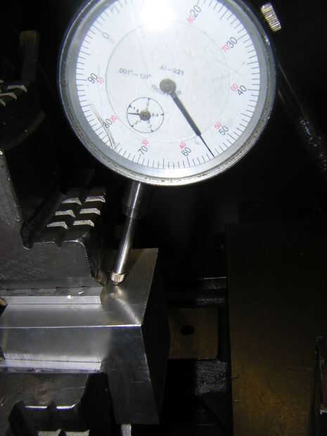 4) Levante la aguja del indicador de dial para no ser golpeado por el cubo y gire el mandril a 180 grados. Encontrar el número de baja otra vez, en el lado opuesto y calcular la diferencia. Ahora hace lo mismo que marcar en una pieza redonda. Apretar y aflojar las mordazas, mantener control de ambos lados y, los puntos bajos a ser igual (o tan igual como usted quiere que sean, generalmente a obtener dentro de 0.001 de cada uno.)