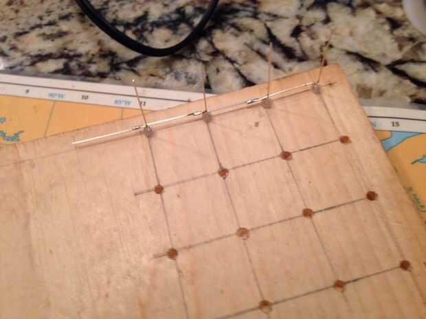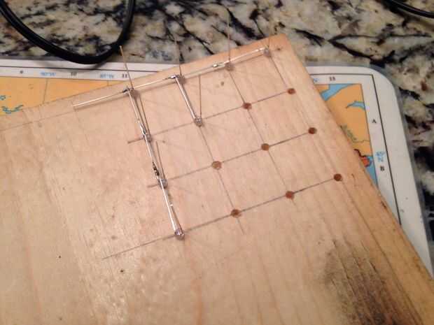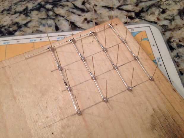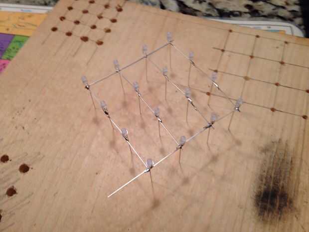 Ver las anteriores fotos + Notas para una guía visual sobre cómo soldar los LEDs juntos. Cuando se hace, cada capa debe tener un cable que sale de su esquina; Esto será importante más tarde así que asegúrese de que cada capa tiene ese cable que sale de la misma esquina. Compruebe todos los LEDs con las baterías AA; es mucho más fácil reemplazar un LED que cuando se construye el cubo entero.