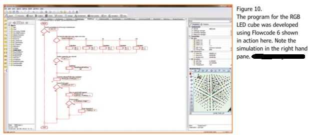 Para agregar la funcionalidad incorporada he creado una matriz de 16-bit variablesto almacenar cada uno de los valores de color de LED en el cubo. Luego he creado una rutina que podría ser llamada varias veces para manejar cosas como registrar los datos de los búferes y conmutación entre los ocho canales comunes. Finalmente todo lo que se dejó para hacer fue agregar código en el get y set macros de color para permitir el arreglo de discos puede leer y escribir cuando no se ejecuta a través de la simulación. El componente final es ahora disponible [3] que simplemente pueden ser arrastradas sobre el panel de Flowcode. El programa de Flowcode se muestra en la figura 10.