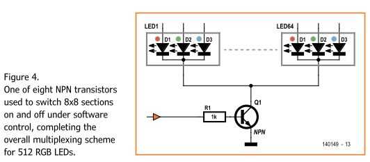 Para controlar los otros siete 8 × 8 segmentos de la pantalla tenemos un segundo método de multiplexación. Para ello tomamos los pasadores de cátodo de todos los LEDs dentro del segmento de 8 × 8 y conectarlos todos juntos. Luego conectamos a tierra a través de un transistor de NPN que nos permite habilitar y deshabilitar todos los LEDs en el segmento de 8 × 8 a la vez utilizando una señal de control solo para pin de la base del transistor. La figura 4 muestra esquemáticamente el método.
