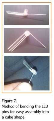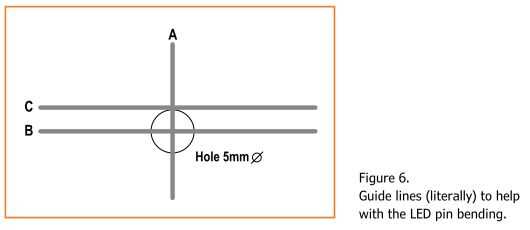 El primer paso para el montaje fue tomar todos los 512 LED y doblarlas correctamente. Para ello perforó un agujero de 5mm en un pedazo de madera y comprueba que un LED caber cómodamente y al ras de la madera pero podría también ser insertado y quitar fácilmente. Una vez tuve mi agujero correcto dibujé algunas líneas de guía para ayudar a la flexión. Según lo representado en la figura 6,
