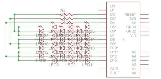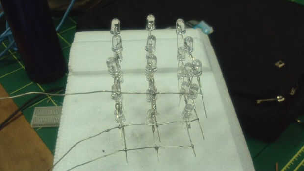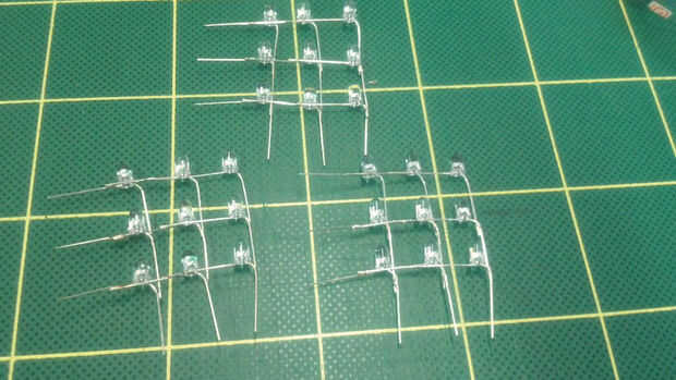 次に先程作成した9組のLEDのペアを、3つづつアノード側にはんだづけをしていき、3 × 3のマトリクスを作成します。