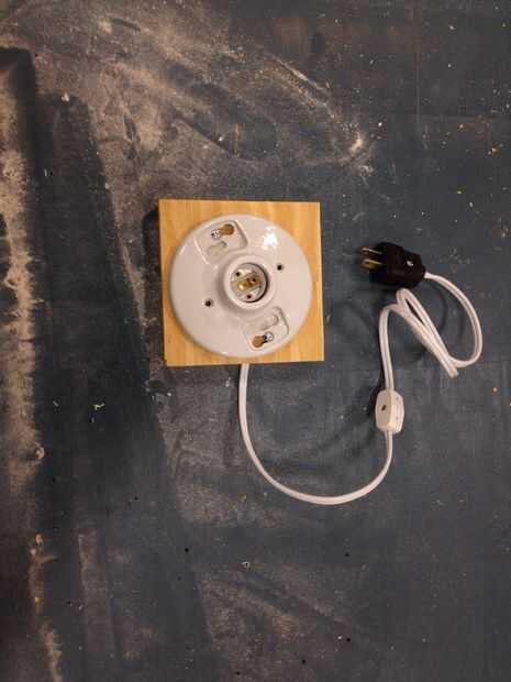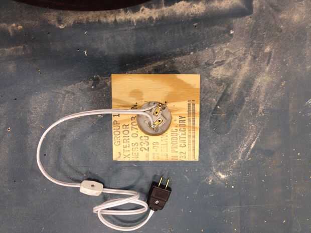 Con el sostenedor de la lámpara, cable de la lámpara, interruptor, enchufe y madera contrachapada de alambre como se muestra arriba. El alambre con la escritura va a los bronceados tornillo no la plata.