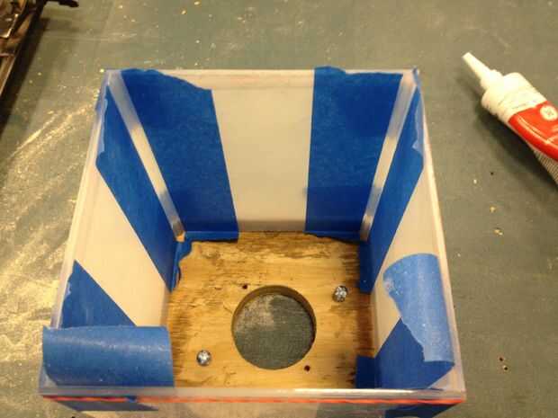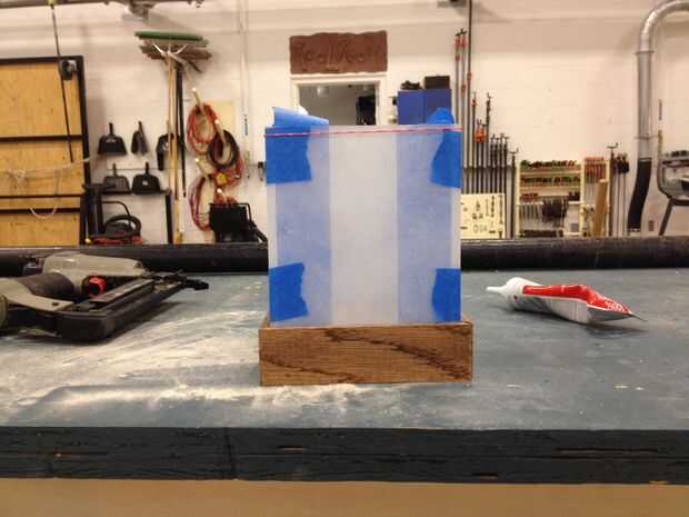 Utilizando pintura en aerosol blanca helada de un lado de la plexi. Colocar todas las piezas de plexiglás en su lugar en la caja y las esquinas de la cinta y colocar una banda elástica alrededor de la parte superior. Usando el silicio poner una línea por cada esquina y para dedo para alisar hacia fuera. Deje que fijó.