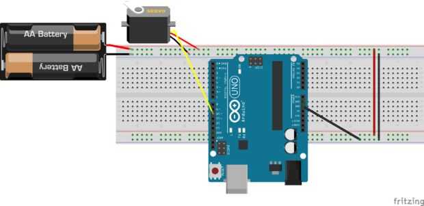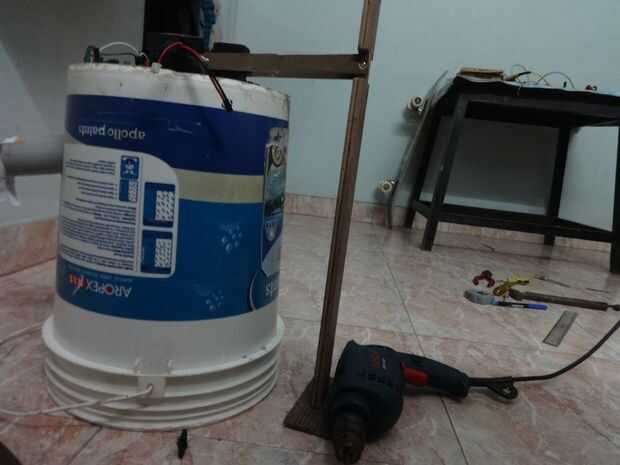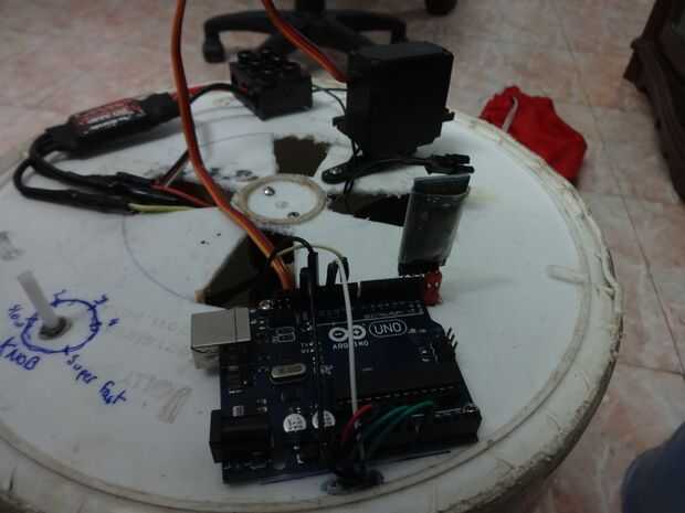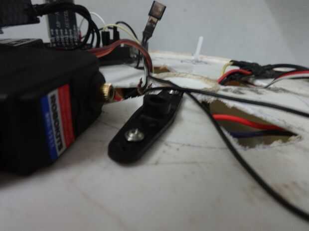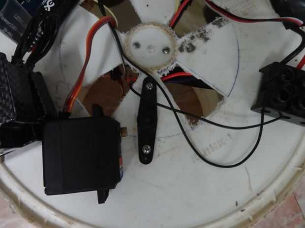 El sistema final tendrá un controlador de smartphone. Para hacerlo posible hemos añadido un motor de servo para mover el cuerpo. Comenzar colocando el cuerno del servo (la pieza de plástico) en la parte superior de la canastilla y el servo a éste. Una vez hecho esto hacer un soporte para el servo de manera que se extiende y se fija al suelo.