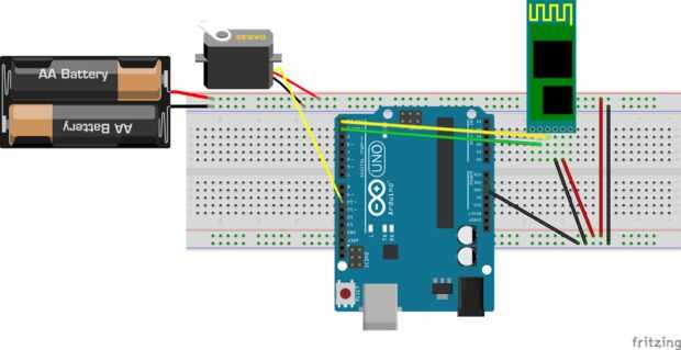 Ahora para el bluetooth. Primero conecte el módulo de bluetooth (hc-05) a tu arduino. Como se muestra en el diagrama anterior. A continuación, instale la aplicación para android desde el siguiente enlace que te permite controlar un servo a través de tu smartphone.