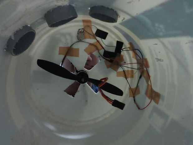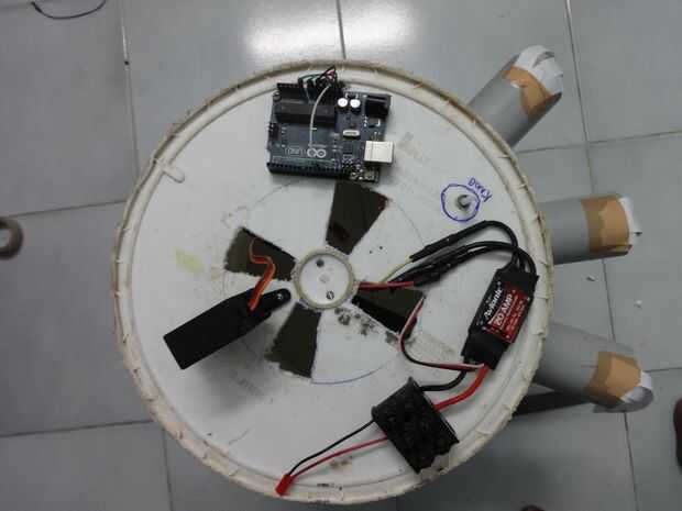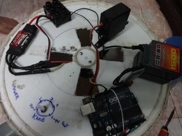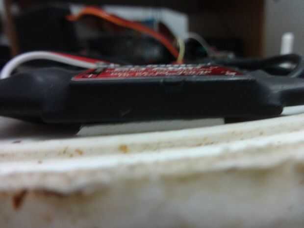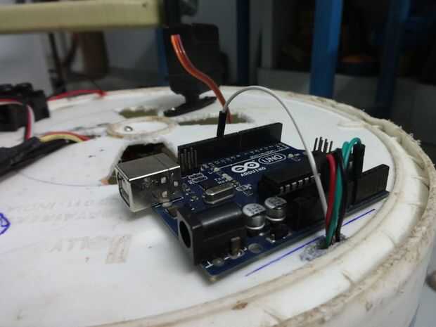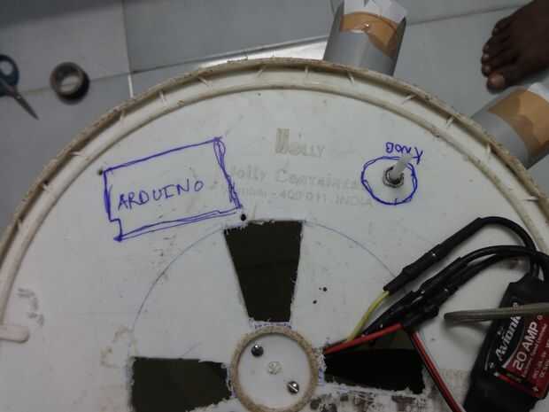 No queremos cables encima de todo el sistema, así para que se vea limpio y ordenado que hecho todos los cables que van dentro de la cubeta y pegadas a las paredes interiores. Mantuvimos el arduino fuera a hacerlo simple para acceder y conectarse al equipo. Para conseguir los cables para el arduino hicimos una ranura pequeña y había pasado los cables a través de las ranuras (como se ve en la foto 2). Nos pegamos todos los componentes en la parte superior de la canastilla con cinta de doble cara