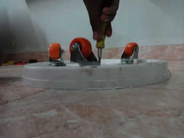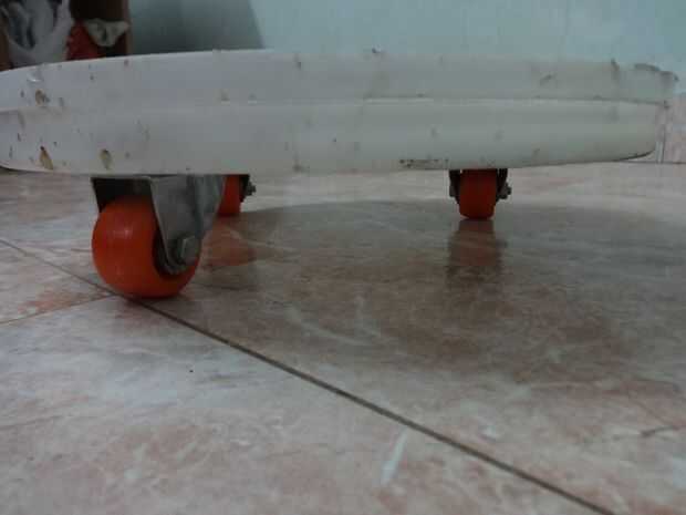 Tomar las ruedas de oficina y colocar sobre la tapa igualmente espaciada. Taladrar y atornillar las ruedas.