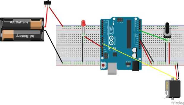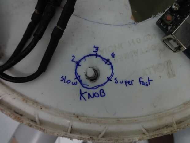 Utilizamos un arduino y un potenciómetro para controlar la velocidad del motor. La perilla tiene cinco niveles: lento, 2, 3, 4 y realmente rápido. También hemos añadido un interruptor y un indicador led para que el cubo parezca más completo. En el diagrama anterior he usado un motor cinemático para mostrar el real motor brushless que utilizamos, (como no esc y el motor sin cepillo en el software que utilizamos). El cableado es el mismo. Siga el diagrama de arriba. Siempre es una buena práctica para realmente tratar el proyecto sobre un protoboard. Colocar la perilla al cubo fue simple que perforó un agujero y pasa el mando a través de dentro del cubo. Del mismo modo también hicimos una ranura para el interruptor de encendido.