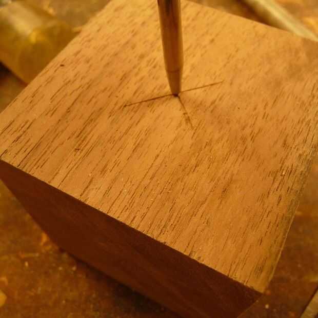 Lleva cubo y marca el centro de todas las seis caras. Esto puede hacerse marcando la intersección de las dos diagonales. Coloque en un tornillo del taladro y taladrar cada cara con un 2" agujero de diámetro 1/2" de profundidad. Para el taladro de calidad mejor utilizar una pieza Forstner. Fácilmente se puede encontrar por menos de $15.