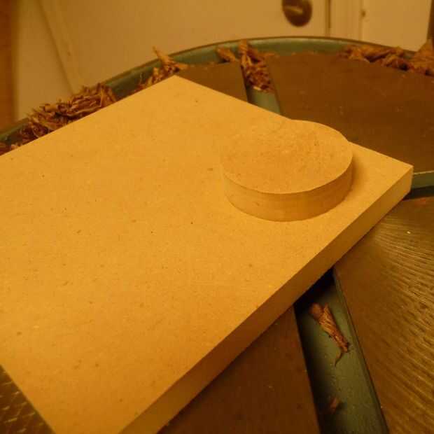 El cubo interior de perforación requiere un accesorio para dar una base plana. Para hacer este accesorio de corte un círculo de diámetro de 2" de ½" MDF grueso o madera contrachapada y pegar a una base plana pequeña. Ahora tienes una plataforma para sostener el cubo interno en su lugar mientras taladra la siguiente serie de seis agujeros.