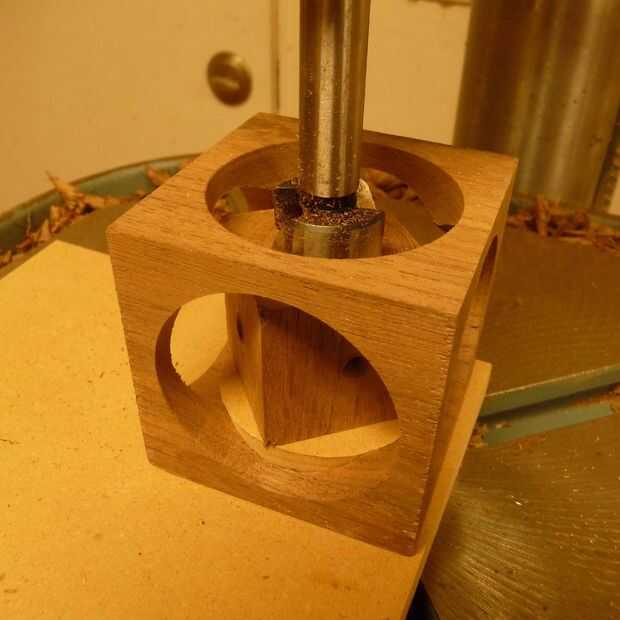 Cada una de las seis caras con un orificio de 1" diámetro 5/16" profundidad, taladro. Una vez más, de la mejor calidad agujero utilice una broca forstner. Esto producirá un nuevo cubo interior conectado en las ocho esquinas. Otra vez redrill los seis agujeros 1/32" más profundo para hacer estas conexiones de las esquinas más pequeñas. Repita esto hasta que la conexión hayan casi desaparecido entonces corta con un cuchillo.