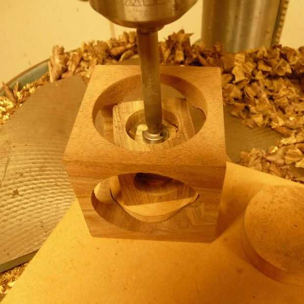 Perforar cada una de las seis caras con un 1/2" agujero de diámetro, 5/32" de profundidad. Esto producirá un nuevo cubo interior conectado en las ocho esquinas. Redrill todos seis agujeros 1/64" más profundo para hacer estas uniones de las esquinas más pequeñas. Repetir este proceso hasta que las conexiones estén casi pasadas y cortar con un cuchillo.