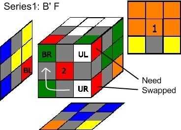 Recuerda las 2 esquinas que necesitan ser intercambiados para arriba en la rebanada superior en las posiciones de la UL y UR. Vas a girar la cara hacia la derecha y esa esquina de UR hacia el segmento inferior. Esto mueve BR a la posición original de la UL (para depósito), UL y la original posición de UR, UR a la posición original de BR