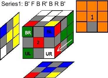 Ahora usted puede ver que ya se intercambiaron las 2 esquinas UL y UR pero solo la cara (lado 2, rojo) está al revés! También aviso que lado 1 (naranja) se ha puesto detrás juntos correctamente.