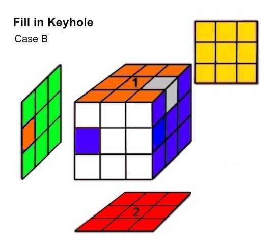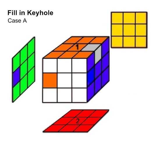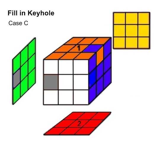 Si tu "arista que se ajusta a la cerradura" es en realidad en el ojo de la cerradura pero mal girada, mantenga el cubo como se muestra en C caso con el ojo de la cerradura en la posición superior derecha. Tenga en cuenta que el borde grises fuera del cubo en el caso C no es el ojo de la cerradura, estoy usando gris para representar un color arbitrario que no nos importa.