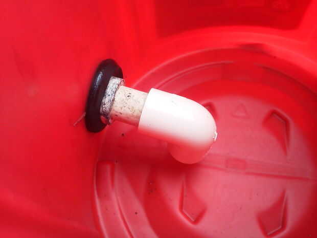 Así que lo que tenemos aquí es un pedazo de 1/2 pvcp tubo conectado a un codo de 1/2" pvcp. Empujé el codo a través del ojal y puedes ver ese poco de ella en el interior del recipiente, allí está conectado a la tubería pvcp y luego del segundo codo con es hacia abajo. Yo no pegue nada, sólo asegúrese de que todo esté colocado apretado. Esto sería para que al final de la temporada de crecimiento se puede desmontar y limpiar y guardar. Sólo un Consejo, presentar baja un poco el codo, al redondo si apagado y utilizado un poco de vaselina para ayudar a conseguir a través del ojal, es un ajuste muy apretado.