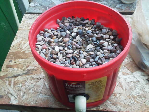 A continuación vas a necesitan algún tipo de sustratos de cultivo para poner en el recipiente. Lo que me pareció ser el más barato es piedra del guisante. Menards vende una bolsa de este material por debajo de 3.00 y un bolso de lo 6 de estos contenedores. Usted puede usar lo que quieras, perlita, vermiculita, etc.. Sin embargo para mí, esta era la manera más barata de ir. De cualquier modo te vas con tu creciente los medios de comunicación, asegúrese de que lo enjuague y no tanta suciedad como sea posible. Llena este recipiente sobre 2/3 por completo dejar espacio para su instalación. Para este envase, estoy usando una planta azul lago Bush haba cavé de mi jardín. Acaban de lavar toda la suciedad de las raíces y está listo para el trasplante.