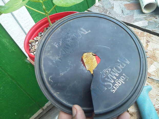 Había matado a especie de esta tapa con mi cuchillo, pero servirá a su propósito. por hacer una rebanada a la mitad y luego hacer un agujero, serás capaz de hacer esto dándole un pequeño giro para que hace una brecha lo suficientemente amplia para ir alrededor del tallo de la planta. La tapa que ayudan a bloquear la luz del sol que reducirá la cantidad de algas. No es necesario hacerlo, de hecho no te molestes con mi otras plantas y hacen muy bien.