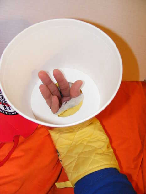 Coloque el cubo en la parte superior del guante y coloque su mano a través del agujero en el cubo.