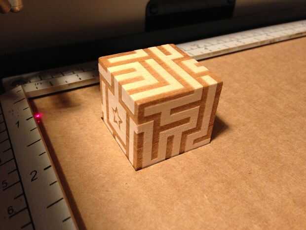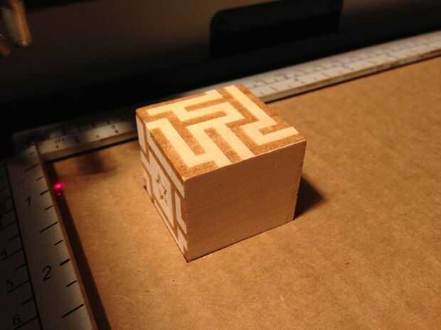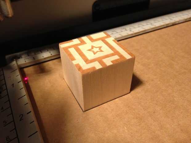 Grabado mi cubo con 100% alimentación / 100% velocidad / 300 ppp (en un láser de 60W). El láser pasa sobre cada uno de los bordes del cubo para que pueda ver un poquito de carbonización en la plantilla de cartón. Si estamos viendo un montón de carbonización reduce el poder y hacer varias pasadas de grabado.
