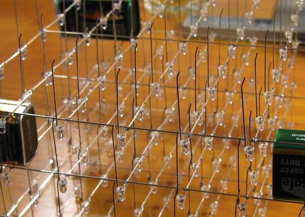 Columnas de cubo en el LED, queremos que cada LED se siente centrado precisamente sobre los LEDs de más abajo. Las patas de los LEDs salen del cuerpo del LED medio milímetro más o menos del borde. Para hacer una soldadura común, tenemos que doblar la pierna del ánodo por lo que toca la pierna del ánodo del LED abajo.