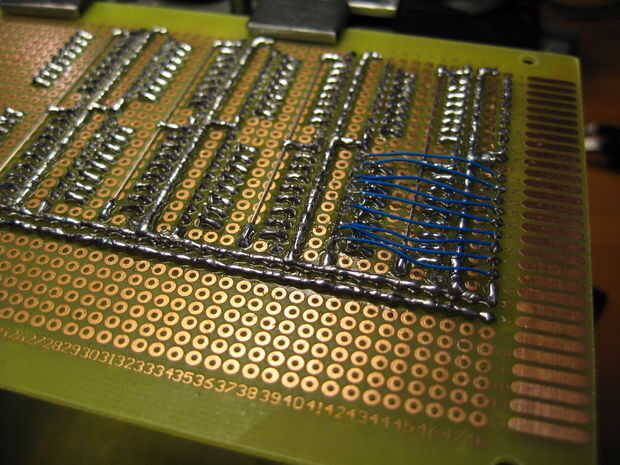 En la esquina inferior derecha, se puede ver que hemos empezado a soldar el bus 8 + 1 bits conectando el pestillo de ICs. Mira lo fácil que es ver lo que los cables de señal y lo que es distribución de energía!