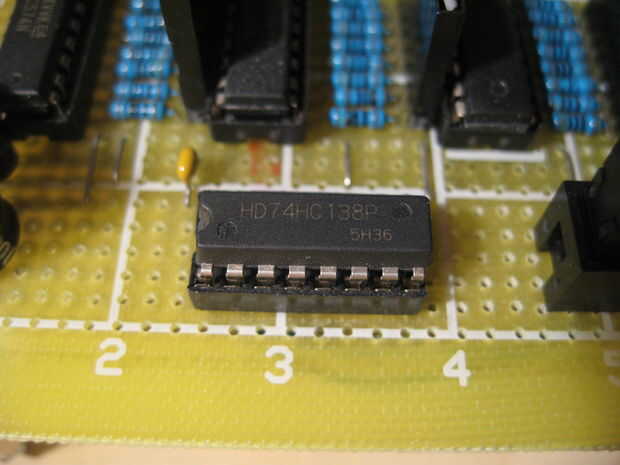 Empezar por soldar las conexiones GND y VCC. Si utiliza el método de seguimiento de soldadura para ejecutar líneas GND/VCC que desea hacerlo antes de cualquier otros cables en lugar de la soldadura. Un cerámico de 100nF condensador de filtrado se coloca cerca de los pines VCC y GND de la 74HC138.
