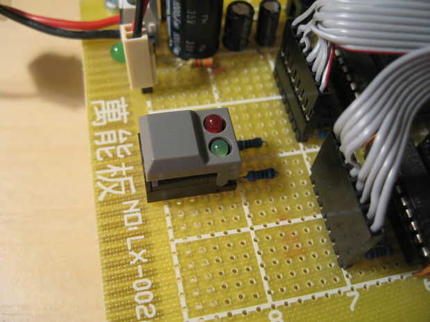 El primer botón se monta en la matriz de cierre PCB, ya que este se sentará en la parte superior del tablero AVR, y queremos que el botón de fácil acceso. Los cables se envían a través del cable de cinta. El segundo botón y el LED de la Junta Directiva AVR y se utiliza sobre todo para la depuración durante la construcción.