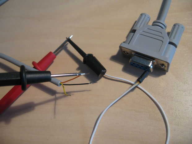 5) Conecte la punta de prueba de un multímetro al pin de DSub9 5 y probe todos los cables hasta que las señales sonoras del multímetro. Ahora han identificado el color de la tierra en el cable. Repita para el pin 2 y 3 (TX y RX).
